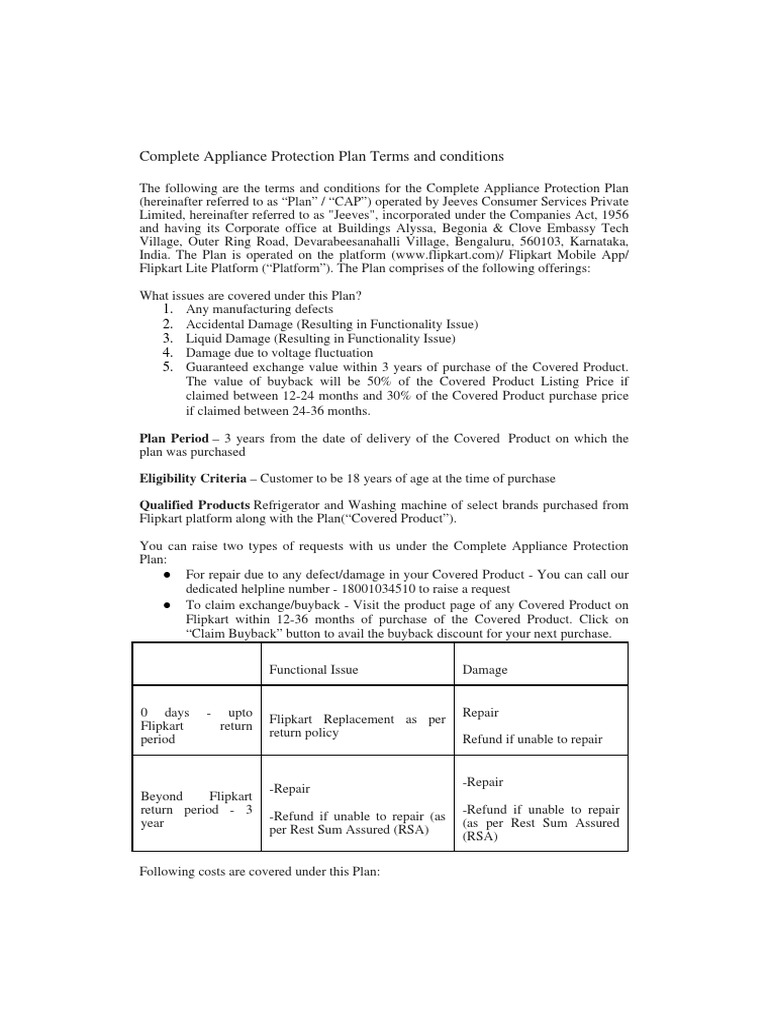 Complete Appliance Protection Plan Terms and Conditions PDF Legal